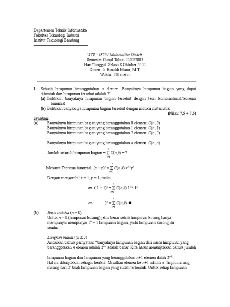 MATEMATIKA DISKRIT - Soal Jawab UTS 1 - ITB.doc